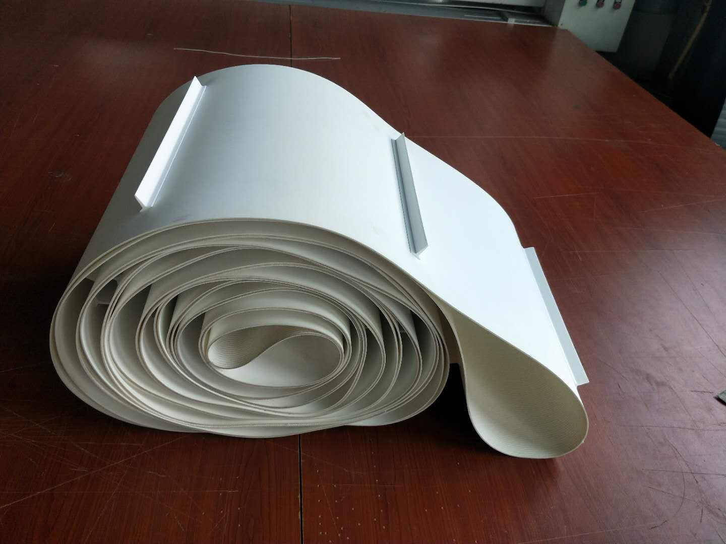 原材料,產品配方科學合理,符合食品衛生標準可與食品直接接觸,色澤適度,無異味。并且具有:耐油、耐腐蝕、耐寒、耐切割等特性。聚氨酯(PU)輸送帶使用經過特殊處理的高強度人工合成聚氨酯織物作為承載骨架,涂覆層由聚氨酯(PU)樹脂制成。不但具有普通輸送帶抗拉強度高、曲繞性好、輕、薄、韌等特點,而且耐油,無毒衛生,容易清洗。該類輸送帶完全符合美國FDA衛生標準,耐磨,抗物理老化,是一種經久耐用的輸送產品。