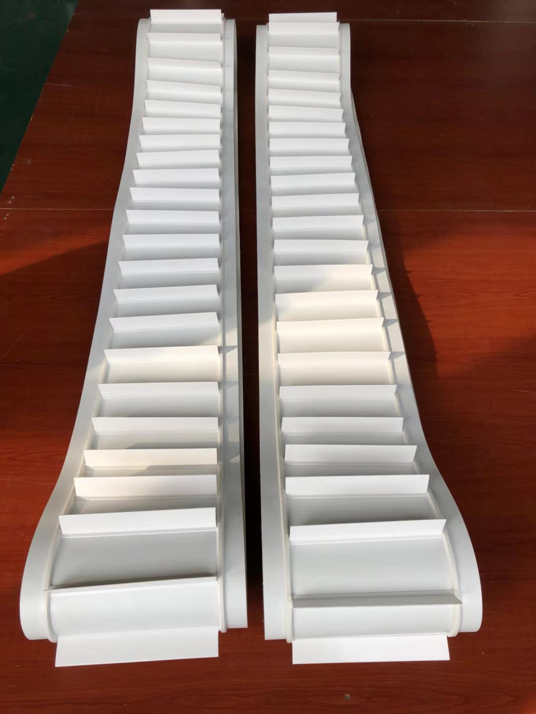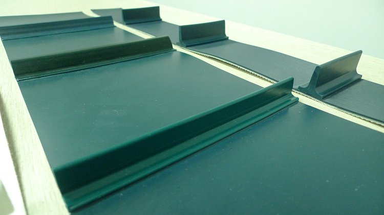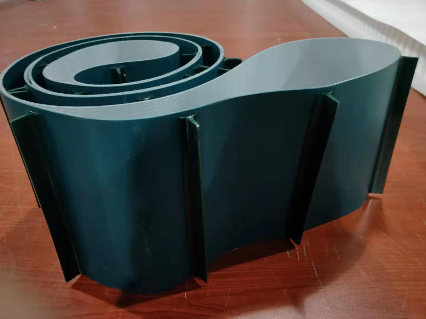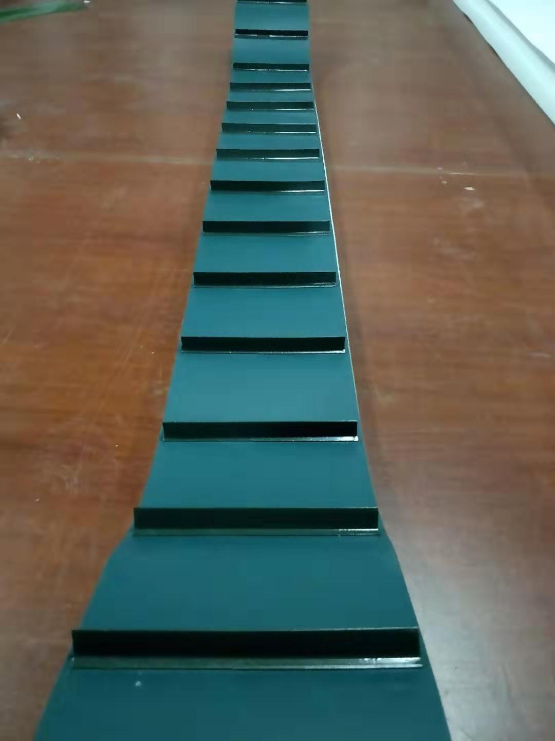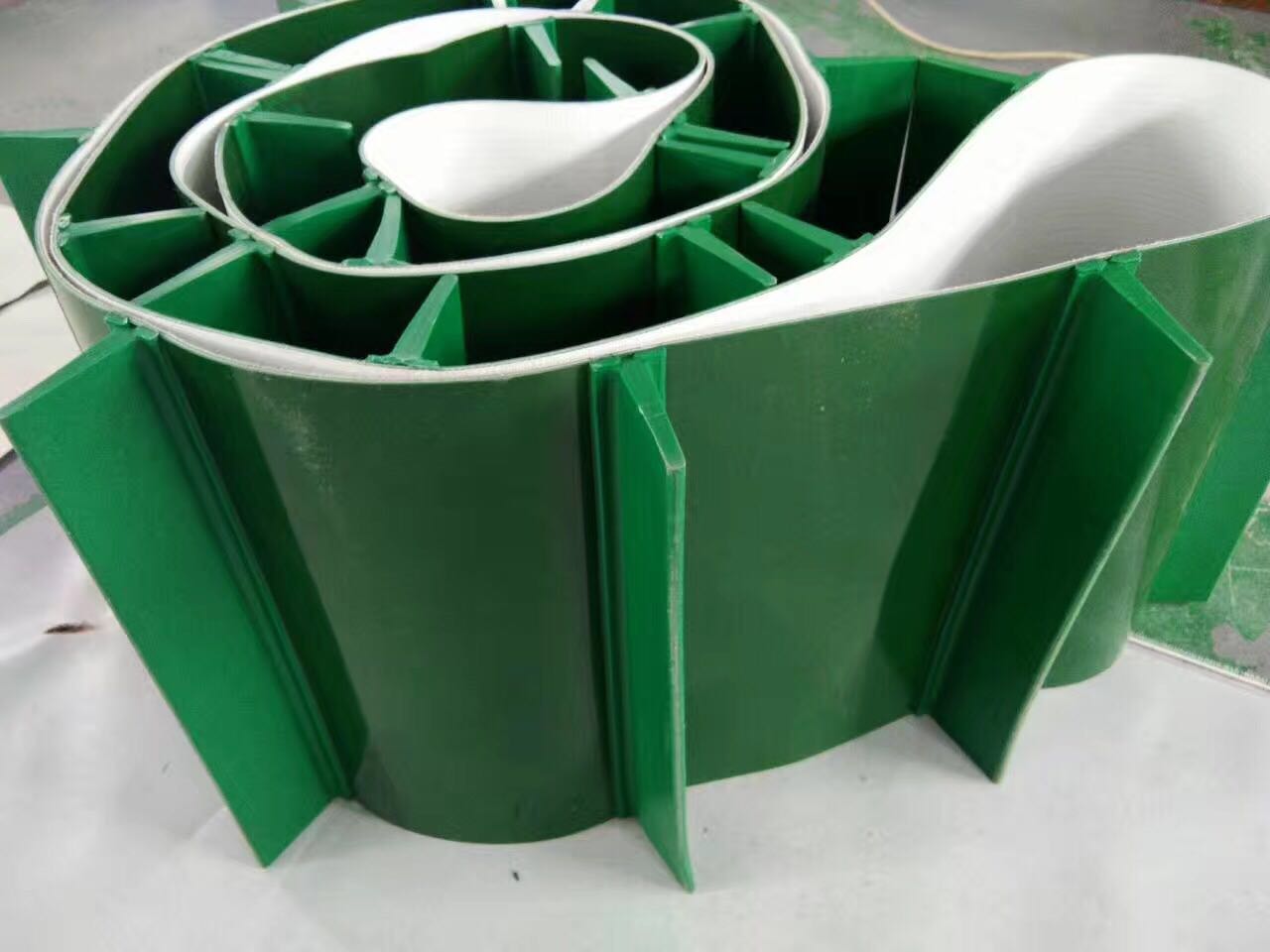 產品材料說明:擋板加工說明:輸送帶(裙邊擋板帶),擋邊起防止物料測滑撒落的作用。為便于轉彎,裙邊設計成波紋狀;橫隔板的作用是承托物料,為了實現大傾角輸送,采用T型TC型。檔邊和橫隔板是用二次硫化的方法與基帶連接的,具有很高的連接強度。用于輸送易散落的粉狀、粒狀、小塊狀、糊狀及液態狀物料。輸送帶材料:環保型材料:輸送帶的生產原材料,產品配方科學合理,符合食品衛生標準可與食品直接接觸,色澤適度,無異味