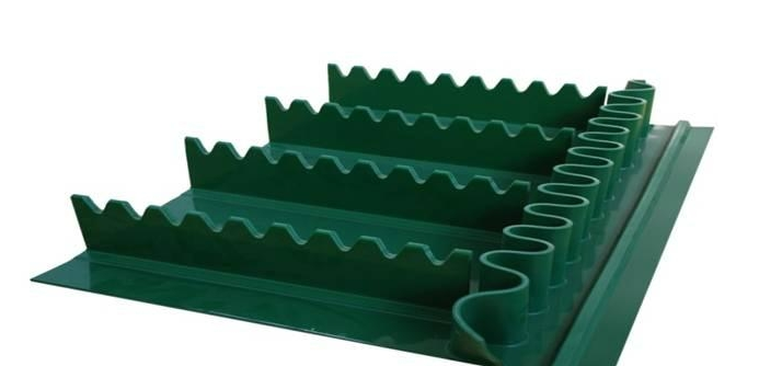 輸送帶(裙邊擋板帶),擋邊起防止物料測滑撒落的作用。為便于轉彎,裙邊設計成波紋狀;橫隔板的作用是承托物料,為了實現大傾角輸送,采用T型TC型。檔邊和橫隔板是用二次硫化的方法與基帶連接的,具有很高的連接強度。用于輸送易散落的粉狀、粒狀、小塊狀、糊狀及液態狀物料。